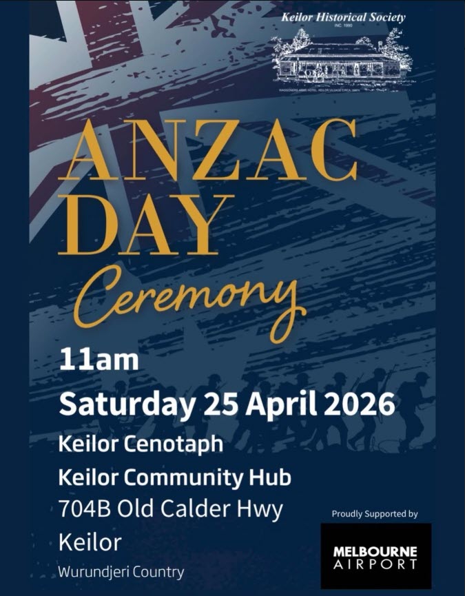 ANZAC Day: Sat 25th April, 10.30am – The Keilor Cenotaph, in front of the Keilor Hub